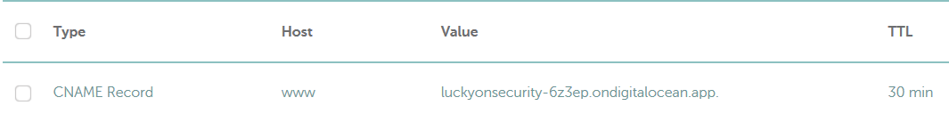 - CNAME Alias = “Auto generated domain from DigitalOcean”