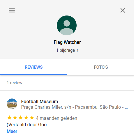 BINGO. Using the ID we find an account with the name: Flag Watcher. Flag Watcher has not uploaded any photos, however, there is one review. Read Flag Watchers review about the football museum to find the flag.